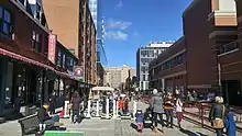 Following the pilot project, the same section of Argyle Street was completely reconstructed (along with part of Grafton Street) as an "urban plaza".[7] Ekistics Plan + Design out of Dartmouth, NS was engaged for the detailed design of the project.[8] The conventional asphalt and sidewalk were replaced with high-quality pavers, and the street was made level, with few curbs. The street remained one-way, as it was before. The pedestrian zone was widened, allowing businesses to keep furniture outdoors year-round, and obviating the need for the previous temporary boardwalks.[9] A city planner explained that the project would support the entertainment industry, improve the pedestrian environment, and increase the number of trees along the street.[7] The street remains open to traffic, but can be closed to allow for outdoor concerts, festivals, and other events. It functions similar to a shared space, an urban design approach that seeks to minimize segregation between different modes of transportation.