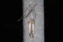 The wingspan is 10–13 mm. The forewings are silvery white, with a pale golden brown streak at the base of the costa. The hindwings are dark gray.[2] Adults are on wing from the end of June to mid August.