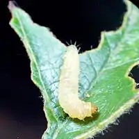 Neonatal larvae are not thought to naturally commit egg cannibalism. However Rock 1968 was able to induce it in laboratory conditions.[4] They go on to feed on various plants, including the leaves and fruit of apple and other fruit trees, as well as spruce and various vegetables. Larvae are green with a pale dorsal stripe and a yellowish head and reach a length of about 16 millimetres (5⁄8 in). The species overwinters in the pupal stage in folded leaves on the ground.