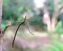 They are long and thin, often resembling a twig. The body length of males is 13 millimetres (0.51 in) and females is 22 mm (0.87 in). Body colour varies from cream, brown or greenish. They are often being found around a metre above the ground, resembling a twig caught in a spider's web.