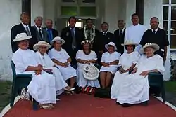 Political leadership or governance in Māori society has traditionally come from two overlapping groups of people – the ariki and the rangatira. The ariki are the "persons of the highest rank and seniority".[5] As the "high-ranking first-born children of first-born children", ariki inherit their positions from their forebears.[6] In particular, their "supreme rank [comes] from the conjunction of a number of senior descent lines from founding ancestors, and ultimately from the gods".[7] In Māori culture ariki were men or women. A modern example of a woman in this leadership role is Te Atairangikaahu the paramount head or Māori Queen of the Waikato federation of tribes.[8][9]