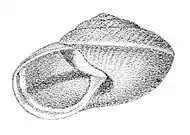 The shell is not flatly convex above, rather coarsely, obliquely, plicately striated and decussated with fine impressed lines, the decussation is sometimes obsolete, more tumid and smoother beneath. The shell color is brownish horny, darker below the periphery, and gradually becoming paler again beneath. The shell has 4½-5[2] whorls, convex above, the last augulate at the periphery.[1]
