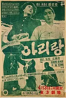 Arirang (Hangul: 아리랑) is a 1926 Korean silent film directed by Na Woon-gyu who also one of the main cast. It is regarded as one of the most influential films in Korean cinema history, as well as the first Korean nationalist film and a critique of the Japanese rule of Korea.[1][2][3] It is named after the traditional song "Arirang," which audiences were said to sing at the conclusion of the film.[4] Arirang is considered a lost film, but a written record of the plot still exists.[2]