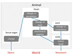 The system worked as follows. The animal's sense organ is altered when it detects an object. This causes a perceptual change in the animal's seat of sensation, which Aristotle believed was the heart (cardiocentrism) rather than the brain. This in turn causes a change in the heart's heat, which causes a quantitative change sufficient to make the heart transmit a mechanical impulse to a limb, which moves, moving the animal's body. The alteration in the heat of the heart also causes a change in the consistency of the joints, which helps the limb to move.[16]