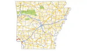 Highway 108 (AR 108, Ark. 108, and Hwy. 108) is a state highway composed of two segments in the southwestern corner of the U.S. state of Arkansas. The northern segment begins as a continuation of State Highway 87 near the extreme southeastern corner of Oklahoma. The northern segment ends at U.S. Highway 59 and U.S. Highway 71 at Ashdown. The southern segment begins 13 miles (21 km) to the south along US 59 / US 71, at the Texas state line. The route ends at U.S. Highway 67 northeast of Texarkana.