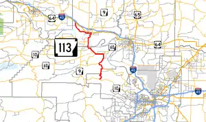 AR 113 begins near Lake Maumelle west of Little Rock.[2] It runs north 5.8 miles (9.3 km) to Wye where AR 300 forms a concurrency. The route then continues heading north for 3.2 miles (5.1 km) to Pleasant Valley where AR 300 continues west. AR 113 continues heading north and heads through Bigelow, Arkansas and then joins with AR 60 west to Houston.[3]