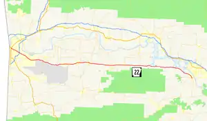 The route begins in Fort Smith at US 64/US 71B. It runs east, crossing I-540/US 71 and the incomplete interchange at the northern end of future I-49.[2] From its western terminus in Fort Smith it carries the Seminole route of the Trail of Tears to AR 255 where the historic route follows AR 255 heading north.[3] From the junction with AR 255, AR 22 concurs with AR 255 through Fort Chaffee and intersects AR 96 east of the installation. The route next enters Charleston where it meets AR 217 and the historic Butterfield Trail. The historic route continues along AR 22 to its eastern terminus in Dardanelle.[4] Continuing east into Branch the highway crosses AR 41.[5] County Line High School is located on the highway between Branch and Ratcliff.[6]