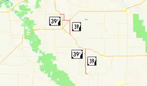 Highway 39 (AR 39, Ark. 39, or Hwy. 39) is a designation for two state highways in southeast Arkansas. The western segment of 9.98 miles (16.06 km) runs from US Route 49 (US 49) at Blackton to US 49/Highway 241.[3] Another segment of 8.89 miles (14.31 km) runs north from Highway 1 and Highway 316 near Turner to US 49 in rural Phillips County.[4]