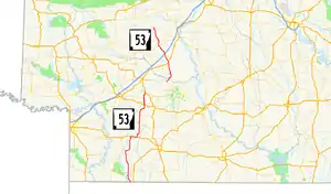 Between September 1929 and March 1930, a second segment between and Bodcaw and State Road 19 (now US 371) was added to the state highway system.[5][6] The route was extended south from Bodcaw to Falcon on July 10, 1957,[7] and extended south to US 82 at Buckner on April 24, 1963.[8] A third section of Highway 53 was created in Lafayette County between the Louisiana state line and McKamie on March 7, 1961.[9][10] The gap between the two southern routes was closed two years later when Highway 53 was extended north from McKamie to US 82 Truck in Stamps on June 23, 1965.[11]