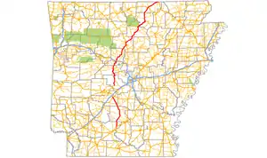 AR 9 begins at Crows and runs north, with AR 298 shooting east from the route.[7] Continuing north into Perry County, AR 9 meets AR 10 at Williams Junction with AR 216 detaching near Harris Rake. The route next meets AR 60 in Perryville before entering Conway County.[8] The route runs with AR 113 and AR 247 briefly south of Morrilton before meeting US 64 and I-40. AR 9 has a spur and business route in Morrilton. AR 915 strays from AR 9 near Overcup Lake. AR 9 also runs with AR 92 from Birdtown to Center Ridge in Conway County.[9] AR 9 concurs with US 65 from Choctaw to Clinton. The route continues to Shirley from Clinton with AR 16, where it is crossed by AR 110.[10] Entering Stone County, AR 9 runs north for several miles before meeting AR 66 in Mountain View. It exits town northbound with AR 5 and AR 16.[11] AR 9 arrows east in Izard County, passing AR 933, a former alignment of AR 9. The route mostly follows the White River in eastern Izard County. AR 9 detaches a spur route and meets AR 69 in Melbourne. The route then meets AR 56 in Brockwell before leaving the county.[12] The route enters its final county, meeting AR 395 before meeting US 62/US 412 and US 62 BUS in Salem. The route trails northeast to Mammoth Spring, where it meets US 63 and terminates, near the Missouri state line.[13]