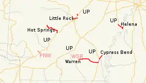 - Warren Branch: 39.4 mi (63.4 km) from Warren to Dermott, with trackage rights over an additional 5.6 miles (9.0 km) to McGehee