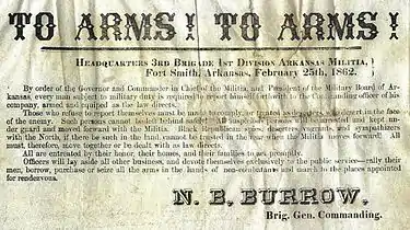 In the spring of 1862 a Union invasion of Northwest Arkansas necessitated an activation of parts of the state militia. In February 1862, General McCulloch issued a proclamation from Fayetteville requesting that "every man turn out and form companies, and rally to meet the advancing enemy". Brigadier General N. B. Burrow, commander of the 3rd Brigade, 1st Division, Arkansas State Militia reacted by activating his entire brigade consisting of six regiments for approximately three weeks. Later in the Summer of 1862, when Major General Hindman assumed command of the Department of the Trans-Mississippi, the militia regiments were required to provide volunteers for new Confederate regiments or face conscription.
