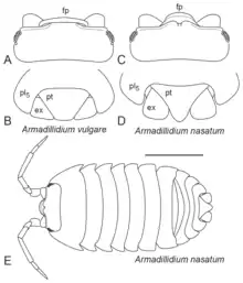 Armadillidium nasatum can reach lengths of up to 21 millimetres.[2][5] Though similar in outwards appearance to Armadillidium vulgare in dark grey color, the main distinguishing feature is pale longitudinal stripes spanning from head to rear and rectangular-like protrusion towards the apex of the head. Like Armadillidium depressum, it does not form a complete ball when enrolled.[2] The tail has a rounded tip with incurved sides, as opposed to most genus Armadillidium species which have a flat tail.[5]