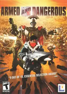 Armed and Dangerous is a 2003 shooter video game created by Planet Moon Studios and released by LucasArts. It is a third-person action-adventure shooter which parodies both other games and several other media such as The Lord of the Rings, Star Wars, and Monty Python and the Holy Grail, using humorous in-game dialogue and cutscenes. The game features known actors and voice actors such as Brian George as main hero Roman, Jeff Bennett, John Mariano and Pat Fraley as his sidekicks Jonesy, Rexus and Q (respectively) and Tony Jay as villain King Forge.[1]