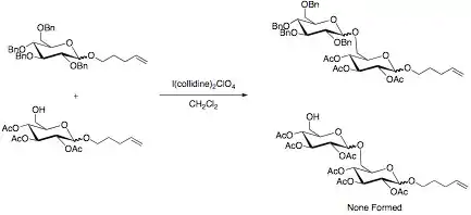 The selectivity in the reaction is due to the stronger electron withdrawing power of the esters compared to the ethers. A stronger electron withdrawing substituent leads to a greater destabilization of the oxocarbenium ion. This slows this reaction pathway, and allows for disaccharide formation to occur with the benzylated sugar. Other effective electron withdrawing groups that have shown selectivity are halogens and azido groups, while deoxygenation has been proven an effective tool in “arming” sugars.[1][2]