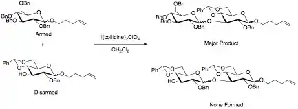 The armed/disarmed approach to glycosylation is an effective way to prevent sugar molecules from self-glycosylation when synthesizing disaccharides. This approach was first recognized when acetylated sugars only acted as glycosyl acceptors when reacted with benzylated sugars. The acetylated sugars were termed “disarmed” while the benzylated sugars were termed “armed”.