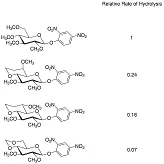 Further work has shown that the effect of 1,3-dioxanes and 1,3-dioxolanes on disarming sugars can be attributed to the electronics of the systems as well as torsional strain. When a 1,3-dioxane is formed between O-4 and O-6, the oxygens adapt an anti-periplanar geometry with O-5. This orientation allows for hyperconjugation of O-5 to O-4 and O-6, removing electron density from O-5. The loss of electron density at O-5 results in a destabilization of the oxocarbenium ion, slowing its formation, and “disarming” the sugar. Experiments were conducted by altering the configuration of the O-6 and examining the rate of hydrolysis of these compounds. The gauche-gauche orientation seen in the second example has a higher rate of hydrolysis due to its longer bond length. The hydrogen at C-5 is able to hyperconjugate with O-6, effectively lengthening the bond. This increase in bond length decreases the inductive electron withdrawing ability of O-6, causing a higher rate of hydrolysis than the other two conformations.[4] The effect of anti-periplanar orientation is also visible in comparing glucopyranose and galactopyranose hydrolysis. Glucopyranose has an anti-perplanar orientation between O-4 and O-5, while galactopyranose does not and shows the appropriate increase in reactivity.[5]