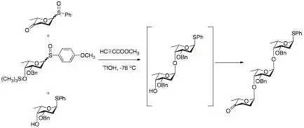 The advantage of “arming” and “disarming” glycosyl donors lies in their synthetic use. By disarming the glycosyl, a selective coupling can be achieved. The disarmed portion of the disaccharide can then be armed through selective deprotection. The disaccharide can then be coupled to a disarmed sugar. This process can be repeated as many times as necessary to achieve an efficient synthesis of a desired oligosaccharide with minimal loss of material to undesired coupling. This can be especially useful in “one-pot” synthetic methods. In these methods, multiple sugars are added to the reaction mixture. One of the sugars is armed as the glycosyl donor, and reacts quickly with a glycosyl acceptor. The non-reducing sugar then acts as a glycosyl acceptor as a protecting group that is easily lost in solution reveals a free hydroxyl group. This reacts with a donor that was disarmed, forming the oxocarbenium ion at a slower rate, producing the desired trisaccharide.[6]