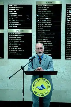 After the Spitak earthquake of 1988 in Armenia, Der Kiureghian played a leading role in establishing the American University of Armenia in Yerevan as an affiliate of the University of California. He served as the founding Dean of the College of Engineering (1991–2007) and as Interim Provost (2011–2012) of AUA concurrently with his position at Berkeley. He has also served as the founding Director of the Engineering Research Center of AUA (1991–2004), a has been founding member of the Board of Trustees of AUA. He served as interim president of the university since the departure of President Bruce Boghosian in July 2014. In January, Dr. Armen Der Kiureghian has accepted the position of president of AUA.[1] In May 2019, he passed the baton to Dr. Karin Markides.[2]