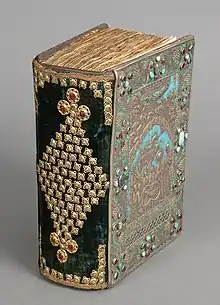 | Medium | Ink and tempera on parchment with a cover of silver, gilt, jewels, enamel |