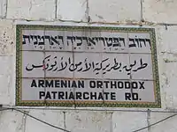 The Armenian Quarter (Arabic: حارة الأرمن, Harat al-Arman; Hebrew: הרובע הארמני, Ha-Rova ha-Armeni; Armenian: Հայոց թաղ, Hayots t'agh)[1][2][lower-alpha 1] is one of the four sectors of the walled Old City of Jerusalem. Located in the southwestern corner of the Old City, it can be accessed through the Zion Gate and Jaffa Gate. It occupies an area of 0.126 km² (126 dunam), which is 14% of the Old City's total. In 2007, it had a population of 2,424 (6.55% of Old City's total). In both criteria, it is comparable to the Jewish Quarter. The Armenian Quarter is separated from the Christian Quarter by David Street (Suq el-Bazaar) and from the Jewish Quarter by Habad Street (Suq el-Husur).