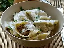 A common dish of Armenian cuisine is pilaf (եղինձ; yeghints). Pilaf is a seasoned rice, bulgur, or shelled wheat dish often served with meats such as lamb or beef. Armenian recipes may combine vermicelli or orzo with rice cooked in stock seasoned with mint, parsley and allspice.[16] One traditional Armenian pilaf is made with the same noodle rice mixture cooked in stock with raisins, almonds and allspice.[17] Armenian rices are discussed by Rose Baboian in her cookbook from 1964 which includes recipes for different pilafs, most rooted in her birthplace of Aintab in Turkey.[18] Baboian recommends that the noodles be stir-fried first in chicken fat before being added to the pilaf. Another Armenian cookbook written by Vağinag Pürad recommends to render poultry fat in the oven with red pepper until the fat mixture turns a red color before using the strained fat to prepare pilaf. Pilaf made with bulgur and liver is a specialty of Zeytun (present day Süleymanlı).[19]