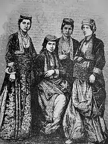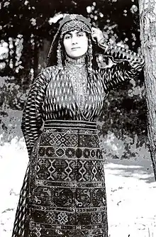 The Armenian Taraz (Armenian: տարազ, taraz;[lower-alpha 1]), also known as Armenian traditional clothing, reflects a rich cultural tradition. Wool and fur were utilized by the Armenians along with the cotton that was grown in the fertile valleys. During the Urartian period, silk imported from China was used by royalty. Later, the Armenians cultivated silkworms and produced their own silk.[1][2]