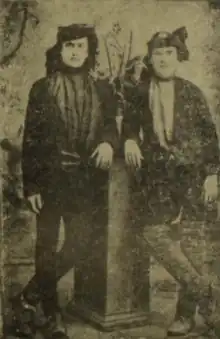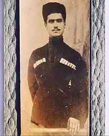 The standard headgear of Eastern Armenians was a fur hat - Papakh (Armenian: փափախ), sewn from sheep's skins.[11] Papakhs came in a variety of different shapes and sizes, with men of different regions and villages having different preferences. Generally speaking, men from Southern Armenia and Karabakh preferred a taller and more cylindrical style of papakh, while men from Northern Armenia usually wore one that was low and wide. The most expensive and prestigious was considered to be made from Bukhara sheep wool, which was worn by representatives of the wealthy classes, especially in cities. In these cities, very high, close to cylindrical, hats were worn complete with a chuhka with folding sleeves. The headgear and hat, in particular, were the embodiment of the honor and dignity of an Armenian man. Throwing his papakha on the ground was equated to his shame and dishonor. According to traditional etiquette, in certain situations, the man was supposed to take off his hat at the entrance to church, during funerals, when meeting highly revered and respected people, etc.[1]