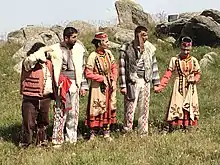 The men's clothing complex also included a leather belt, which was worn over the arkhalugh. The leather belt had a silver buckle and false ornaments engraved with plant ornaments.[5]