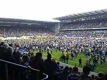After World War II, a new league with all teams who competed in the Gauliga Westfalen was formed. Arminia were relegated and failed to win re-promotion. In 1947–48, Arminia were a third division side for the first time in their history. After a dominating season in the Bezirksklasse, Arminia was docked 14 points because they fielded an ineligible player.[10] The next season was already under way when the Landesliga (II) was expanded by two teams. Arminia took their chance, won the league and gained promotion to the Oberliga West.[11]