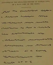President Ulysses S. Grant appointed Long's wife as postmistress for Charlottesville, Virginia.[5] Although entirely blind, Long moved to Charlottesville and began writing Memoirs of Robert E. Lee. The lengthy biographical compendium of the service of the Army of West Virginia was published in 1886. Long had written two other manuscripts: A reminiscence of his army life and a biographical contrast between Stonewall Jackson and "Old Hickory" (Andrew Jackson).[13] Long's manuscripts were sold in April 2015 at his Great-grandnephew, Charles Andrews', estate auction.[14] Long's Old Hickory and Stonewall Jackson was subsequently edited by Frederick J. Reber II and published on Amazon.com.[15] As of 2019, Long's manuscript on his own army life remains unpublished.