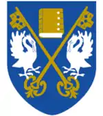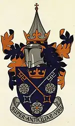Escutcheon: Gules, two keys in saltire between in chief a representation of St. Cuthbert's pectoral cross Or, in base an ancient crown, and in fesse two like crowns Or. | |