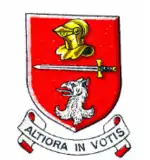 Escutcheon: Azure, a lion rampant, in dexter chief two arrows in saltire, points downward, tied in the centre with a bow and enfiled with a wreath of laurel, all argent |