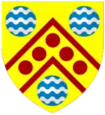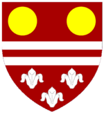 Escutcheon: Argent, a chevron between three cinquefoils gules; a chief ermine, thereon a cinquefoil of the second. | |