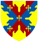 Escutcheon: Argent, on a cross Azure three crowns Or in fess and two escallops of the first in pale, in the first quarter a lion rampant reguardant of the second. |