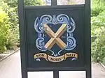 Escutcheon: Per pale Vert and Sable in chief two Crosses Potent quadrate and in base a Stag lodged within a Palisade all Argent. | |