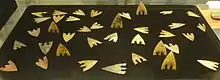 The Armorican Tumulus culture are famous for their tombs of chiefs, richly endowed with prestigious goods deposited in wooden boxes. They deliver dozens of so-called Armorican arrowheads finely cut in blond flint from the Lower Turonian deposits of the Cher valley. They are undoubtedly the work of flint craftsmen and the symbol of the power of the chiefs of the time.[7] Along with his arrows are bronze daggers and axes, the former being kept in leather scabbards and sometimes decorated with small gold studs (1 to 3 mm). One grave can accumulate up to ten daggers – beyond any measure in the rest of Western Europe in the Early Bronze Age. The daggers are of the Armorican type and generally decorated with meshes parallel to the edges and pierced with six rivet holes. More exceptionally, silver goblets, gold or silver chains, pendants and archer's armbands in amber, Whitby jet or gold and large stone sharpeners may be found in these graves.[1][8]