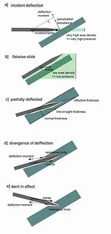 On the other hand, that very same deformation will also cause, in combination with the armour plate slope, an effect that diminishes armour penetration. Though the deflection is under conditions of plastic deformation smaller, it will nevertheless change the course of the grooving projectile which again will result in an increase of the angle between the new armour surface and the projectile's initial direction. Thus the projectile has to work itself through more armour and, though in absolute terms thereby more energy could be absorbed by the target, it is more easily defeated, the process ideally ending in a complete ricochet.