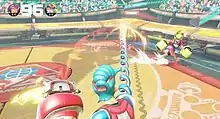 Arms is a 3D fighting sports game in which up to four players can control one of a variety of fighters, with the player able to perform basic fighting actions using extendable arms such as punching, throwing, blocking and dodging.[1][2] Arms features fifteen playable fighters, including Min Min and Twintelle, with five of them being released as downloadable content.[3] Each fighter starts with three unique Arms that can be selected in battle, but the use of all other fighters' Arms can be unlocked in the Get Arms mode. All fighters also have unique attributes in combat.[4] When the attack meter is fully charged, players are able to unleash a high-damage "rush attack" against their opponents. Players can also charge their attacks to temporarily increase damage and utilize elemental effects.[5] Each character has a different set of abilities and unique Arms for different strategies. Players are able to use the system's Joy-Con motion controls or standard button inputs with controllers such as the Pro Controller to operate each Arm individually. Players are also able to customize their Arm load outs, with each Arm being able to be selected independently. Every Arm is different with elemental attributes and varying weights that affect gameplay. Up to four players are able to play in a single match, either in a three or four-way free-for-all, or in a two-on-two mode in which teammates are tethered together.[6][7]