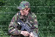 The primary weapon of the cadet forces is the L98A2 Cadet GP Rifle[27] this is a cadet specific version of the British Armed Forces' L85A2 SA80 which has been adapted to fire only on repetition (semi-automatic) and therefore does not have a change lever, the weapon system is chambered in the NATO 5.56x45mm cartridge. In order to become proficient in this weapon system and pass the one-star Skill at Arms (SAA) test, cadets must show they can handle the weapon safely, perform stoppage drills, and field strip the weapon for daily cleaning, in addition to passing one-star Skill at Arms the cadet also receives a Weapon Handling Test (WHT) pass which must be re-qualified every 6 months.[28] Once a cadet has an in date WHT, cadets can fire the weapon using blank rounds in field exercises using the Safe Blank Firing System (SBFS) and with live rounds on a range possibly gaining marksman qualification badges based on their accuracy. There is also a non-firing training version of the GP Rifle, the L103A2 DP (Drill Purpose), this is generally used for teaching cadets the basics of the weapon they are handling and for rifle drill. The L98A2 Cadet GP Rifle is also capable of being fitted with the British Army L41A1 sub-calibre adaptor which enables the weapon to fire .22 rimfire ammunition.