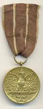 The Army Medal for War 1939-1945 (Polish: Medal Wojska za Wojne 1939-45) was created in 1945 by the Polish government in Exile (in London) to reward members of the Polish ground forces for service during World War II. The eligibility criteria were: six months of operational service during World War II, or 12 months in a non-operational role.[1] The medal could be conferred up to four times, although for a subsequent award the period of service was doubled.