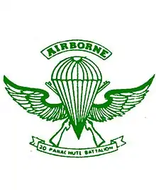 This is the umbrella body of specialized units in the Kenya Army tasked with special operations based at Gilgil, Naivasha.[1] The brigade forms part of Kenya Special Forces with other specialized units from the Kenya Air Force and Kenya Navy. These units consist of the 20th Parachute Battalion, 30th Special Forces and 40th Rangers Strike Force.[2] The 20th Parachute Battalion is the regiment's oldest unit formed on March 17, 1983 and presented with its Regimental and Presidential Colours during the 1990 Jamhuri Day celebrations. However the plan to set up the unit was mooted immediately Kenya gained its independence when on October 14, 1964 forty officers were sent to Britain for Parachute Basic Training Course at Royal Air Force Base, Abingdon.[3]