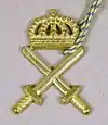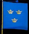 The coat of arms of the Army Staff. It was later used by the Army Command (Arméledningen, AL) from 1994 to 1997. Blazon: "Azure, the lesser coat of arms of Sweden, three open crowns or placed two and one. The shield surmounted two swords in saltire or".[13]