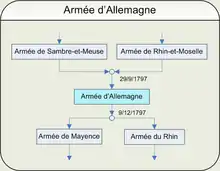 The Army of Germany (Armée d'Allemagne) was one of the French Revolutionary armies, formed by a decree of the French Directory dated 29 September 1797 (8 vendémiaire Year VI) by merging the Army of Sambre-et-Meuse and the Army of the Rhine and Moselle and commanded from the decree until 6 October by général Saint-Cyr under général Hoche. The decree was enacted between 7 and 20 October 1797, and from 7 October until 13 December the unit was under the command of général Augereau and deployed with the armée du Nord. Another decree of 9 December (19 frimaire year VI) that year, executed from 14 to 16 December, re-split this army into the Army of Mainz and Army of the Rhine.