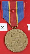 The Army of Puerto Rican Occupation Medal was a service medal of the United States Army which was created by order of the United States War Department on 4 February 1919. A retrospective award created decades after the action commemorated, the medal recognized Army service from 14 August through 10 December 1898 in Puerto Rico. The Army of Puerto Rican Occupation Medal was commemorative by nature although was approved for wear on active military uniforms. A similar medal, the Army of Cuban Occupation Medal was created for occupation service in Cuba following the Spanish–American War. The regulations for the Army of Cuban Occupation Medal were re-written to include regulations for the Army of Puerto Rican Occupation Medal.