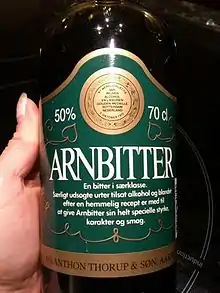 Arnbitter is a Danish bitters produced and distributed by the Copenhagen based company Just Drinks, originally produced and developed in Aarhus.[1] The drink can be traced back to the 1950s and is sold under the slogan "Hverken ny, trendy eller importeret" (Neither new, trendy nor imported).[2] The recipe is secret but includes ginger, cloves, saffron and licorice root. Arnbitter is mixed in large 2,500 litre copper tanks where it is stored for 3 months before bottling.[3]