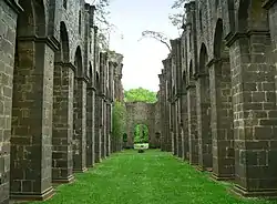 The cloister, or inner yard, is surrounded by the Bursenbau, the church ruin, the main abbey building (1775), and the early Gothic eastern wing (Ostflügel) that housed the dormitory for the brothers on the upper floor and the chapter hall, which doubled as the burial site of the abbots, on the lower floor. The former was demolished in the 19th century, but has been reconstructed and now serves as a venue for concerts. The latter has become part of the war grave cemetery, with a memorial to the war dead. The war cemetery now occupies the cloister, where rows of graves are interspersed with crosses made of Basaltic tuff.[26]