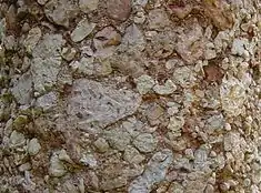 The same author (1937) indicated that the peninsula of Setúbal was, during the Mesozoic, covered by shallow seas.[7] During a great part of the Jurassic, Arrábida was a marine ecosystem covered by ocean, resulting in the formation of Dolomite limestones, today being constituted by white limestone.[7] From the Jurassic there was a movement of submersion, that formed "alternating layers of limestone, sandstone and breccia, with a clear angular unconformity on the previous limestone that ministered part of the material".[7] The sedimentary breccia is a valuable ornamental stone, more commonly known as Arrábida Marble.[7][8]