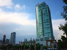 The Arriva Tower is a 128 m (418 ft) 34-storey[1] high-rise condominium in Calgary, Alberta, Canada. Located in Victoria Park, a historic neighbourhood in Calgary's Beltline neighbourhood, north of the Stampede Grounds and Scotiabank Saddledome. The glass and steel skyscraper features brick and sandstone finish at the base, to reflect the architectonic style of the surrounding historic buildings of the Warehouse District.