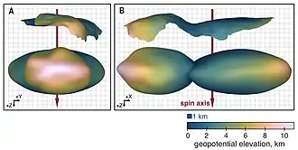 The longest axes of the lobi are nearly aligned with the rotational axis, which is situated between them.[43] This near-parallel alignment of the lobi suggests that they were mutually locked to each other, likely due to tidal forces, before merging.[43] The alignment of the lobi supports the idea that the two had individually formed from the coalescence of a cloud of icy particles.[51]